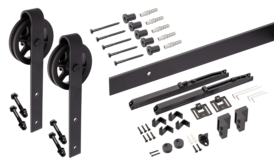 Ensemble de ferrures pour portes intérieures de type rustique. Comprend un guidage supérieur de 2m et deux amortisseurs. Pour épaisseur de matériau 40 - 45mm. Capacité de charge 80kg. L'ensemble comprend : roulettes, matériel de fixation au mur, matériel de fixation au guidage, butées de fin de course, tige de guidage, guidage supérieur, amortisseurs. La distance entre la partie supérieure du guidage supérieur et le plafond doit etre d'au moins 160mm. Composition du kit voir ci-dessous. Les articles individuels contiennent des dessins techniques.