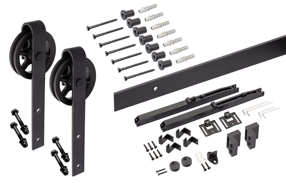 Ensemble de ferrures pour portes intérieures de type rustique. Comprend un guidage supérieur de 3m et deux amortisseurs. Pour épaisseur de matériau de 30 - 40mm. Capacité de charge 80kg. L'ensemble comprend : roulettes, matériel de fixation pour mur, matériel de fixation pour guidage, butées de fin de course, cheville de guidage, guidage supérieur, amortisseurs. La distance entre la partie supérieure du guidage supérieur et le plafond doit etre d'au moins 160mm. Composition complete du kit voir ci-dessous. Les articles individuels contiennent des dessins techniques.