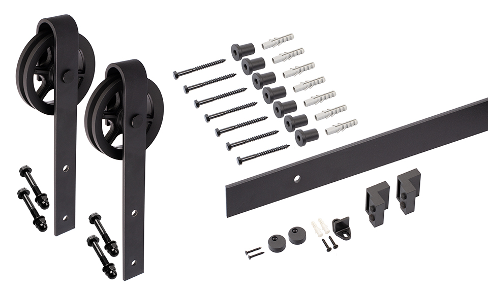 Ensemble de ferrures pour portes intérieures de type rustique. Comprend guidage supérieur 3m. Sans amortisseurs. Pour épaisseur de matériau 30 - 40mm. Capacité de charge 80kg. L'ensemble comprend : roulettes, matériaux de fixation au mur, matériaux de fixation pour le guidage, butées d'extrémité, axe de guidage, guidage supérieur. La distance entre la partie supérieure du guidage supérieur et le plafond doit etre d'au moins 160 mm.