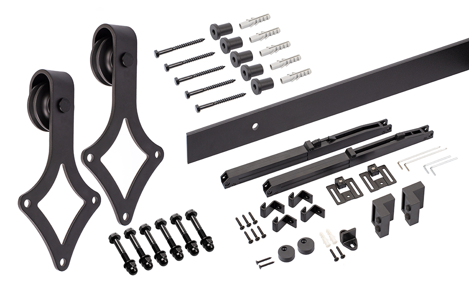 Ensemble de ferrures pour portes intérieures de type rustique. Comprend un guidage supérieur de 2m et deux amortisseurs. Pour une épaisseur de matériau de 30 - 40mm. Capacité de charge 80kg. L'ensemble comprend : roulettes, matériel de fixation pour mur, matériel de fixation pour guidage, butées de fin de course, tige de guidage, guidage supérieur, amortisseurs. La distance entre la partie supérieure du guidage supérieur et le plafond doit etre d'au moins 110mm. Composition de l'ensemble voir ci-dessous. Les articles individuels contiennent des dessins techniques.