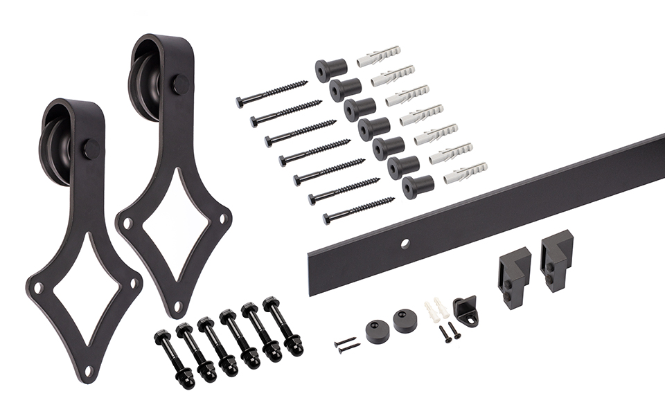 Jeu de ferrures pour portes intérieures de type rustique. Comprend un guidage supérieur de 3 m. Sans amortisseurs. Pour épaisseur de matériau de 30 - 40 mm. Capacité de charge 80 kg. L'ensemble comprend : roulettes, matériel de fixation au mur, matériel de fixation pour le guidage, butées de fin de course, goupille de guidage, guidage supérieur. La distance entre la partie supérieure du guidage supérieur et le plafond doit etre d’au moins 110 mm.