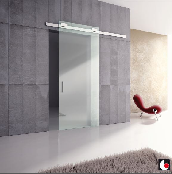 Ensemble de ferrures pour portes en verre avec freins. Pour 1 vantail incluant un guidage supérieur de 3 m de longueur. Finition - anodisé argent brossé. Pour portes d'une capacité de charge de 30 - 80 kg et d'une largeur de 1000 - 1500 mm.