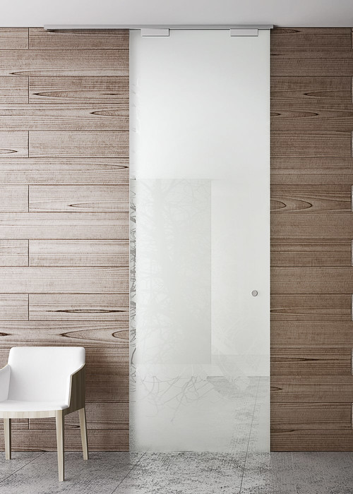 Ensemble complet de quincaillerie pour porte intérieure coulissante en verre avec absorbeurs de butée. Le poids maximal de l'ouvrant est de 120 kg, la largeur minimale de l'ouvrant est de 600 mm. Pour une épaisseur de verre de 12 - 12,7 mm.