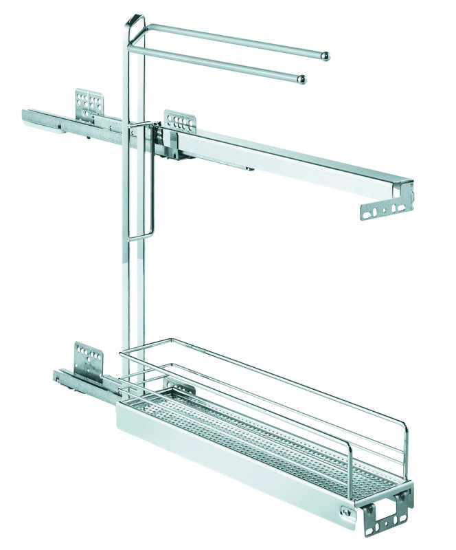 Panier gris pour corps avec une largeur extérieure de 150 mm avec deux supports pour chiffons et une étagere en bas. Les porte-manteaux sont revetus de caoutchouc pour empecher les chiffons de glisser. Éclairage intérieur : largeur : 112, profondeur : 481, hauteur : min. 540 mm. Montage de la porte a 90°. L’étagere avec fond plein empeche les fuites et la chute des petites pieces.