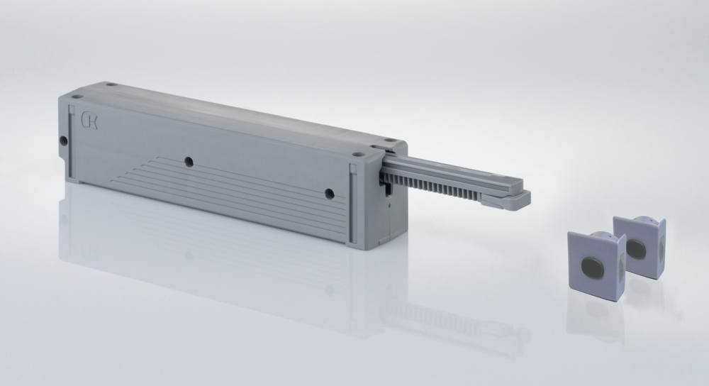 Mécanisme permettant l’ouverture sans poignée des armoires alimentaires Dispensa. Moteur électrique qui, apres pression, ouvre la porte. Utilisation uniquement en combinaison avec une coulisse a sortie totale et pour un caisson de 300 mm et plus large. Apres la fermeture de l’armoire alimentaire, il est possible de réouvrir apres environ 5 secondes (réglage systeme du moteur).