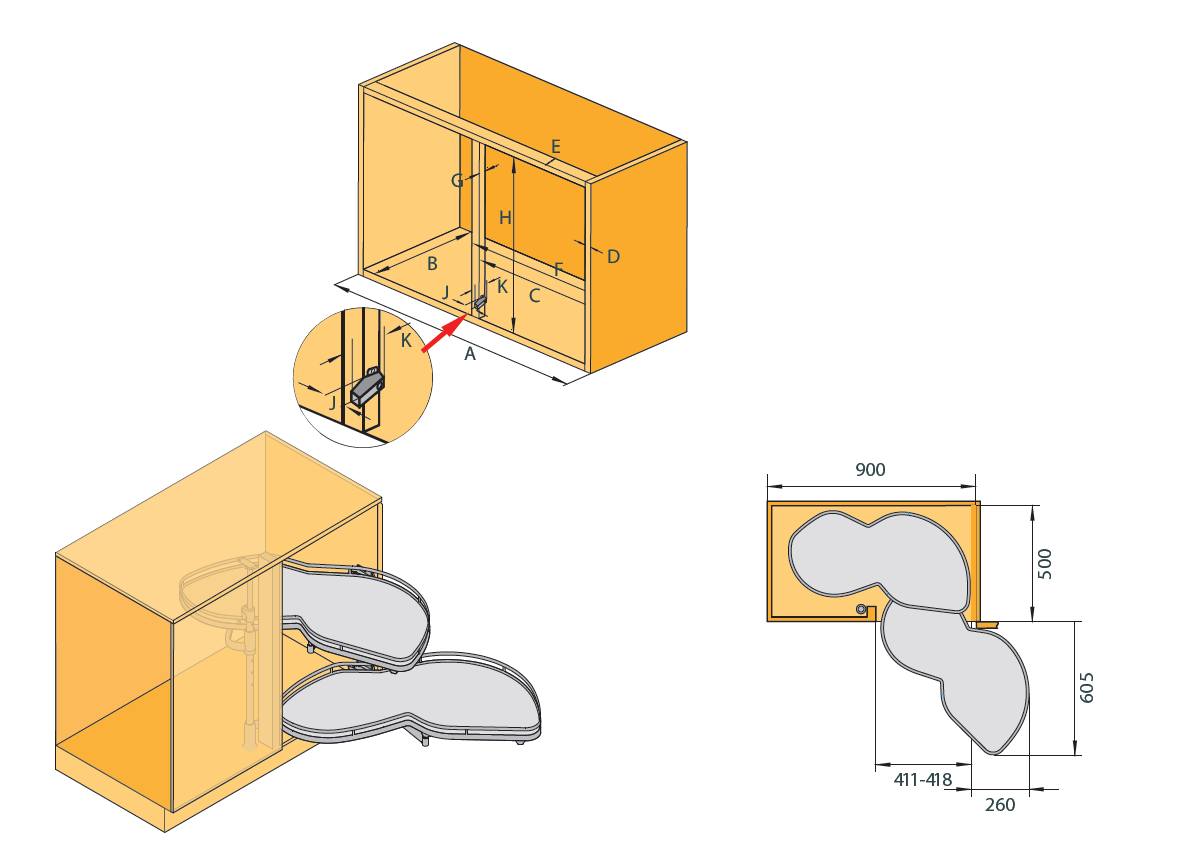 Ensemble de deux étageres Arena STYLE (fil plat) chromé pour solution d’armoire d’angle inférieur (appelé angle aveugle). LeMans II. Il est possible d’ajouter un amortisseur externe a LeMans II qui rapproche l’étagere, atténue la fermeture et évite les chocs. Fond avec finition antidérapante Anti-slip. Pour corps 900mm. Montage de l’amortisseur sur la tige extérieure. Dimensions intérieures du corps : largeur : 860, profondeur 500, hauteur : 600-750 ou 720-900mm. Dimension des portes 411-418mm. Tige de montage + fixation sur le côté - 160132 (600-750mm), Amortisseur externe pour version droite - 318463. Capacité de charge de l’étagere 20kg.
