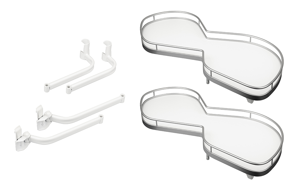 Ensemble de deux étageres Arena CLASSIC ARGENT/BLANC pour solution d'armoire d'angle inférieur (coin aveugle) LeMans II. Fond avec finition antidérapante Anti-slip. Un amortisseur externe peut etre ajouté au LeMans II, qui attire l’étagere lors de la fermeture, l’amortit et empeche les chocs. Pour corps de 1000 mm et ouverture 561-568 mm. Montage de l’amortisseur sur la tige extérieure. Dimensions intérieures du corps : largeur : 960, profondeur : 500, hauteur : 600-750 mm ou 720-900 mm. Dimension minimale des portes 561-568 mm. Tige de montage + fixation sur le côté du corps - 160132, amortisseur externe pour variante De - 318463. Capacité de charge de l’étagere 25 kg.