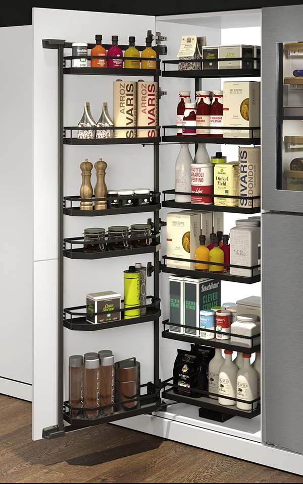 Produit ingénieux : Il est évident que les produits Kesseböhmer sont généralement des produits ingénieux. Ingénieux avec une valeur ajoutée. Nous classons spécialement la solution anthracite parmi les solutions vraiment ingénieuses. Discrete dans le mobilier et pourtant élégante. Elle peut etre facilement harmonisée avec les autres quincailleries tendances foncées (tiroirs coulissants, charnieres…) et constitue une combinaison de couleurs attrayante pour la plupart des matériaux de surface.