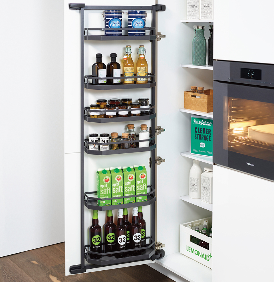 Produit intelligent : Il est évident que les produits Kesseböhmer sont globalement des produits intelligents. Réfléchis avec une valeur ajoutée. Nous classons spécialement la solution anthracite parmi les solutions vraiment intelligentes. Discrete dans le mobilier et pourtant élégante. Elle peut etre facilement assortie a d’autres quincailleries tendance foncées (tiroirs coulissants, charnieres...) et constitue une combinaison de couleurs attractive avec la plupart des matériaux de surface.