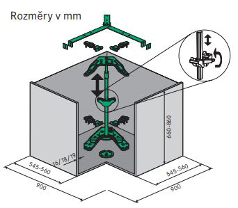 Mécanisme pour solution d'armoire d'angle basse (3/4) REVO 90 avec porte fixée au mécanisme. La porte tourne avec les étageres et, lorsqu'elle atteint l'ouverture d'acces, se ferme automatiquement (avec amortissement). Dimensions intérieures du corps : largeur : 750(800)/850(900), profondeur 750(800)/850(900), hauteur 660-860 mm. Étageres : Arena STYLE : 800 - 135890, 900 - 135891, Arena CLASSIC : 800 - 135923, 900 - 135924, tout fil métallique : 800 - 135892, 900 - 135893. L'ensemble comprend : fixation avant 4 pcs, axe central 1 pc, support de tablette coulissant 1 pc, cadre de fixation supérieur 1 pc.