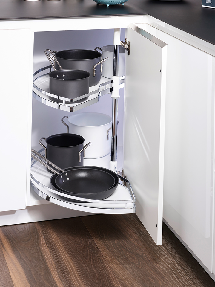 Conçu pour un corps d'angle inférieur d'une largeur de 900 mm (1/2). Ensemble de deux étageres Arena Style, fond avec revetement antidérapant Anti-slip. Conçu pour des corps avec des portes classiques a charnieres. Dimensions intérieures du corps : largeur ? 840 mm, profondeur ? 475 mm, hauteur 655-745 mm. Diametre de l'étagere : 750 mm. La tige télescopique doit etre commandée séparément sous le code 353254.