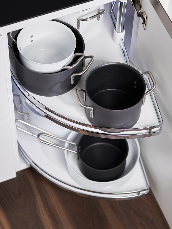 Conçu pour corps d’angle bas de 900 mm de largeur (1/2). Ensemble de deux étageres Arena Classic, fond avec finition Anti-slip antidérapante. Conçu pour corps avec portes a ouverture classique sur charnieres. Dimensions intérieures du corps : largeur ? 840 mm, profondeur ? 475 mm, hauteur 655-745 mm. Diametre de l’étagere : 750 mm. Tige télescopique a commander séparément sous le code 353254.