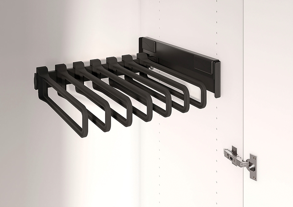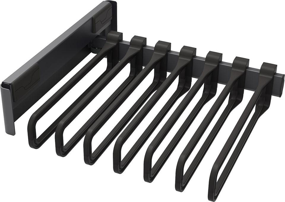 Le porte-pantalons Basic est unilatéral et peut etre monté du côté gauche ou D de l'armoire. Lorsqu'il est placé sous la tige de suspension des vetements, il complete parfaitement l'espace sous les chemisiers ou chemises. Sur sept cintres, vous pouvez suspendre 14 pantalons, toujours deux par dessus. Comme pour les autres porte-pantalons coulissants CONERO, les cintres peuvent etre retirés tres facilement.