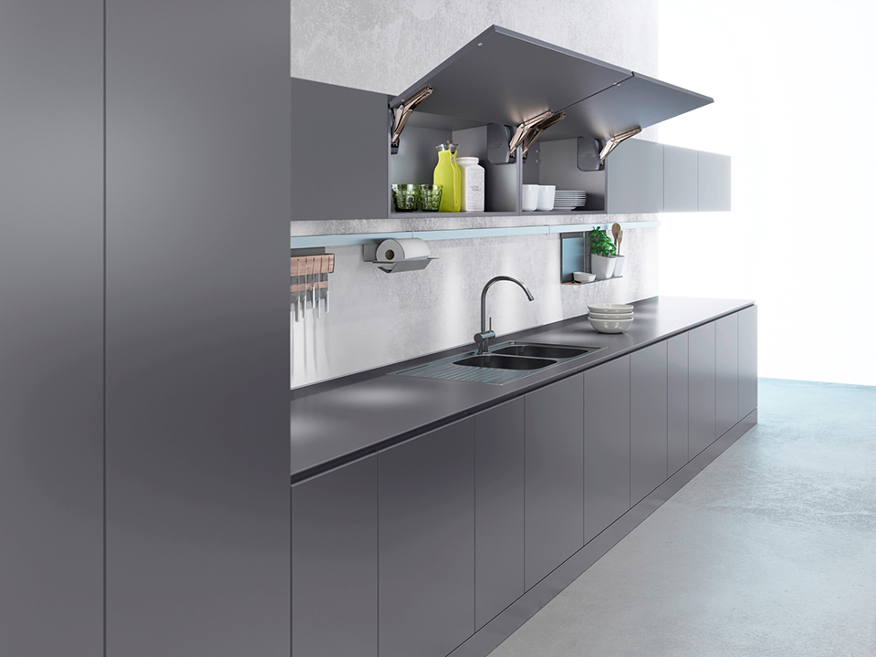 Quincaillerie pivotante avec mouvement doux et montage facile. Angle d'ouverture 107°. L'ensemble comprend une paire d'abattants, des caches de couleur grise, quincaillerie frontale. La force d'ouverture appropriée est déterminée en fonction du poids et de la hauteur de la façade.