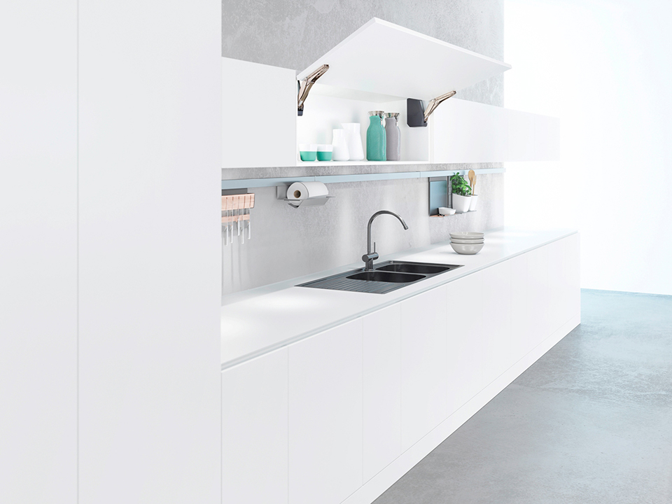 Pour une ouverture sans poignée, en plus du systeme électrique eTouch, il est également possible d’utiliser des pistons PTO, sélection et dimensionnement voir documents associés. La porte s’ouvre partiellement en appuyant, selon la longueur du piston, puis peut etre saisie a la main et ouverte a la position désirée.