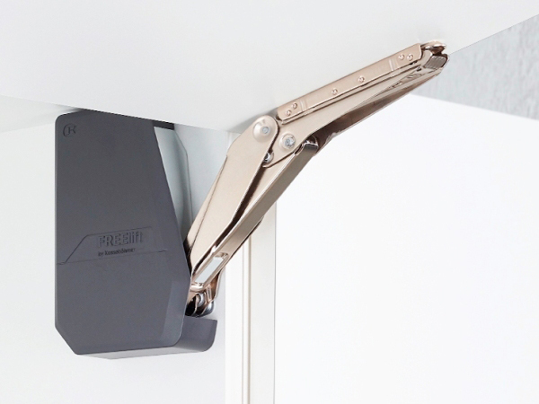 Quincaillerie pivotante avec mouvement fluide et montage facile. Angle d'ouverture 107°. L'ensemble comprend une paire d'abattants, des caches gris, et la quincaillerie frontale. La force d'ouverture appropriée se détermine en fonction du poids et de la hauteur du devant.