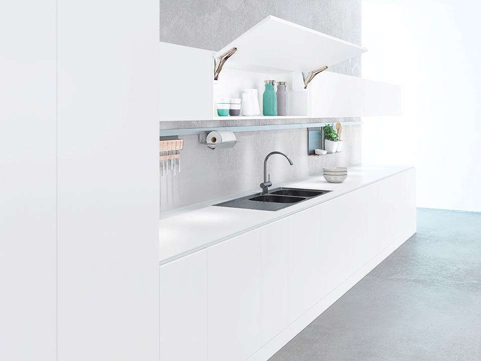 Quincaillerie pivotante avec mouvement doux et montage facile. Angle d'ouverture de 107°. L'ensemble contient une paire d'abattants, des caches gris, quincaillerie frontale. Selon le poids et la hauteur de la façade, vous déterminez la puissance d'ouverture appropriée.