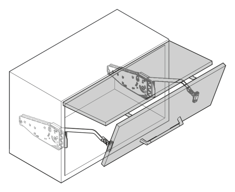 Quincaillerie pivotante avec mouvement doux et montage facile pour façades pliées. L'ensemble comprend une paire d'abattants avec bras et la quincaillerie frontale pour les bras. Destiné pour une hauteur de corpus de 650-730mm. Poids de la façade 9,9 - 7,9kg. Nécessite des caches ainsi que des charnieres supérieures et médianes.