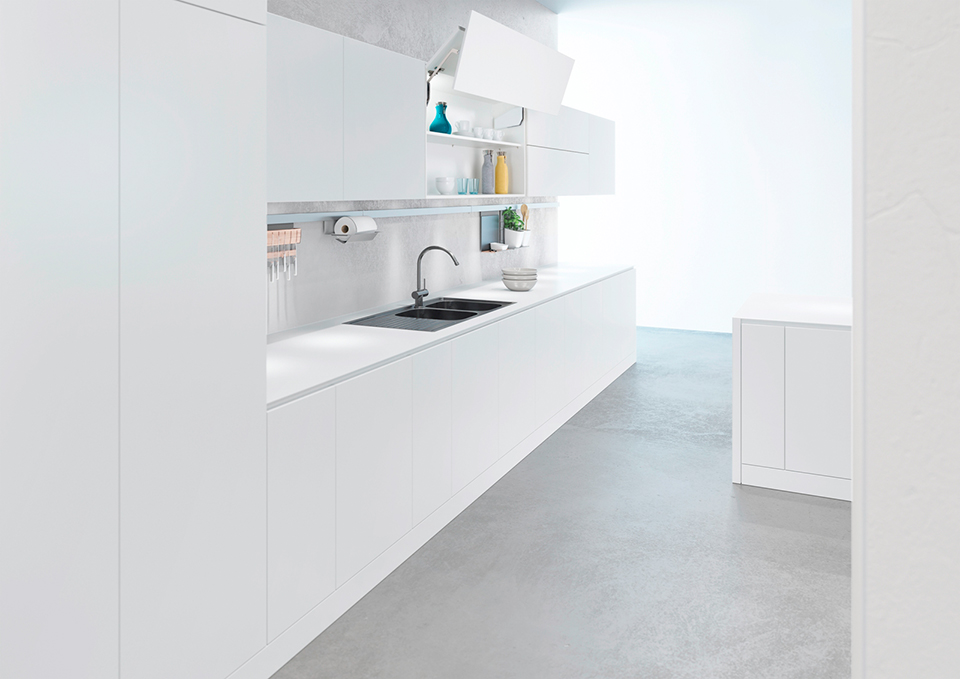 Quincaillerie pivotante avec mouvement doux et montage facile pour façades pliées. L'ensemble comprend une paire d'abattants avec bras et quincaillerie frontale pour les bras. Destiné pour une hauteur de corps de 770-840mm. Poids de la façade 3,2 - 6,7kg. Nécessite d'etre complété par des caches et des charnieres supérieures et médianes.