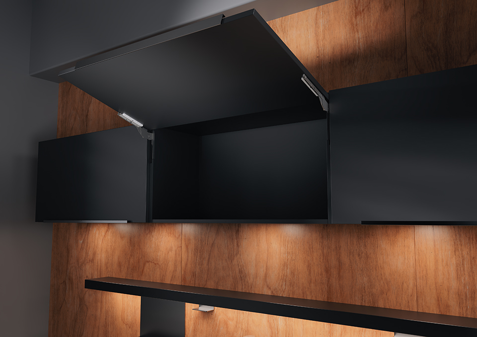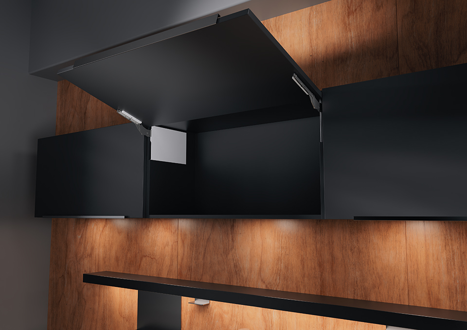 Lift-up FREEslim Flap mechanism - with soft close. The mechanism can be mounted by screwing it on from the inside of the cabinet or recessed by routing it into the side panel from the outside. The maximum cabinet height is 650 mm and the maximum width is 1800 mm. At the same time, the Power Factor must be observed.
