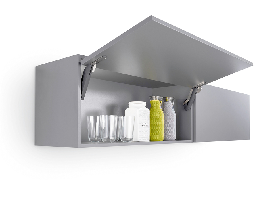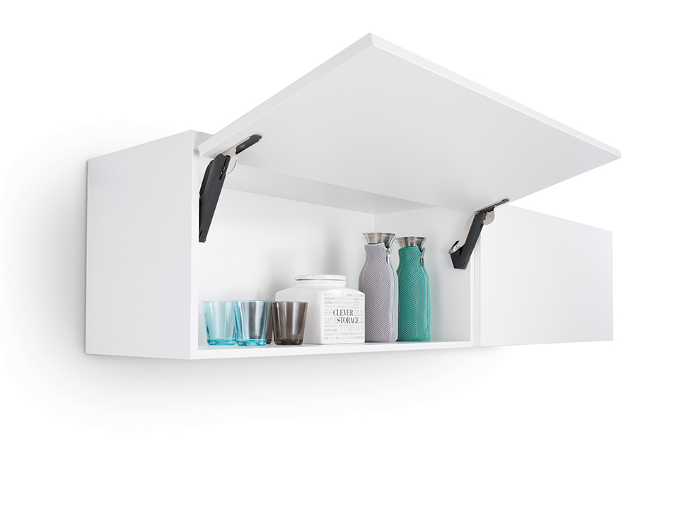 Ensemble complet pour abattant sans poignée a ouverture par pression (PTO - Push To Open) pour armoires hautes sans utilisation de charnieres avec des dimensions minimalistes de quincaillerie. Hauteur du panneau 200-650 mm, largeur jusqu'a 1800 mm. Limiteur d'angle d'ouverture intégré de 107° => 90°.