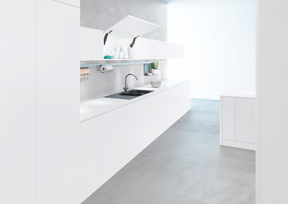 Ensemble complet pour abattant sur armoires hautes sans utilisation de charnieres avec des dimensions minimalistes de quincaillerie. Hauteur de la façade 200-650mm, largeur jusqu'a 1800mm. Limiteur d'angle d'ouverture intégré 107°=>90°.