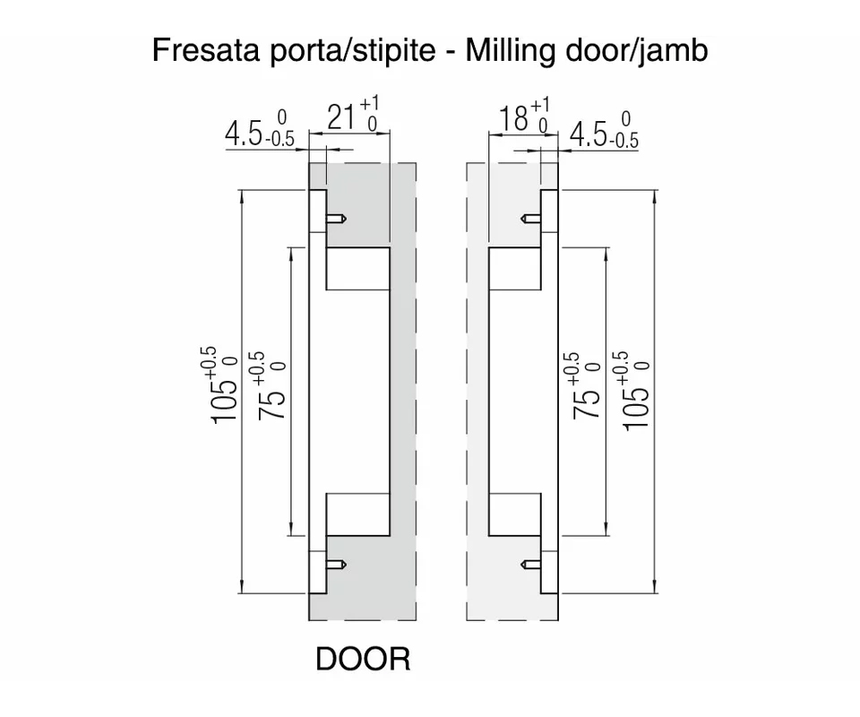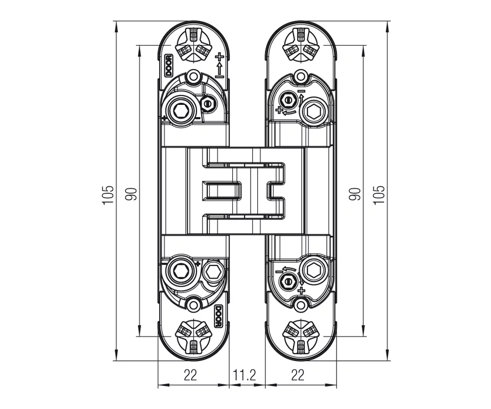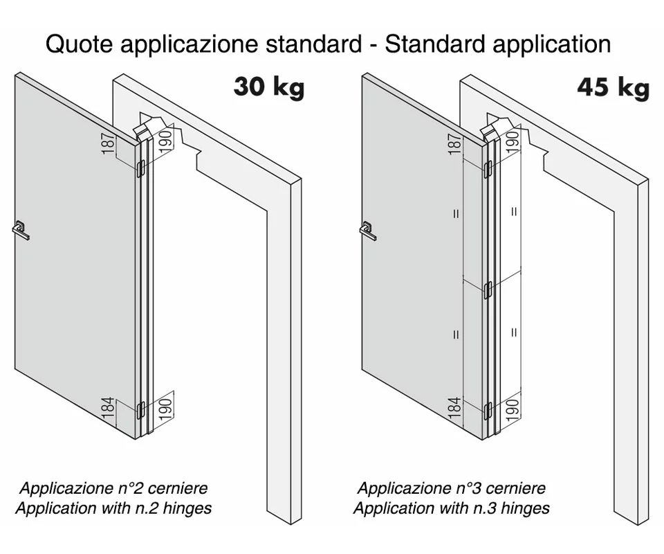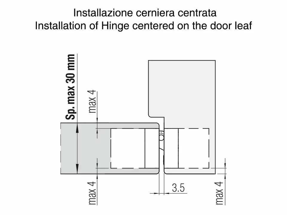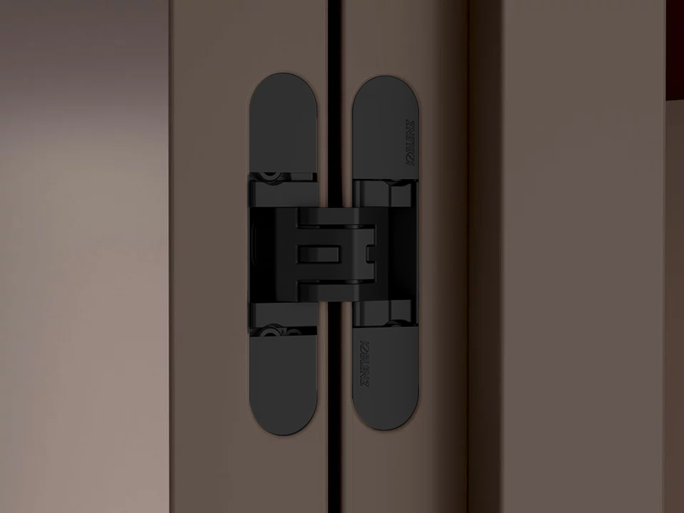 Charniere pour porte sans recouvrement avec réglage 3D. Capacité maximale de charge de la porte 30 kg pour 2 charnieres. Accessoires optionnels sont des fixations pour cadres de porte en bois ou en acier. Gabarit de montage 256045 (cadre) + 268077 (inserts)