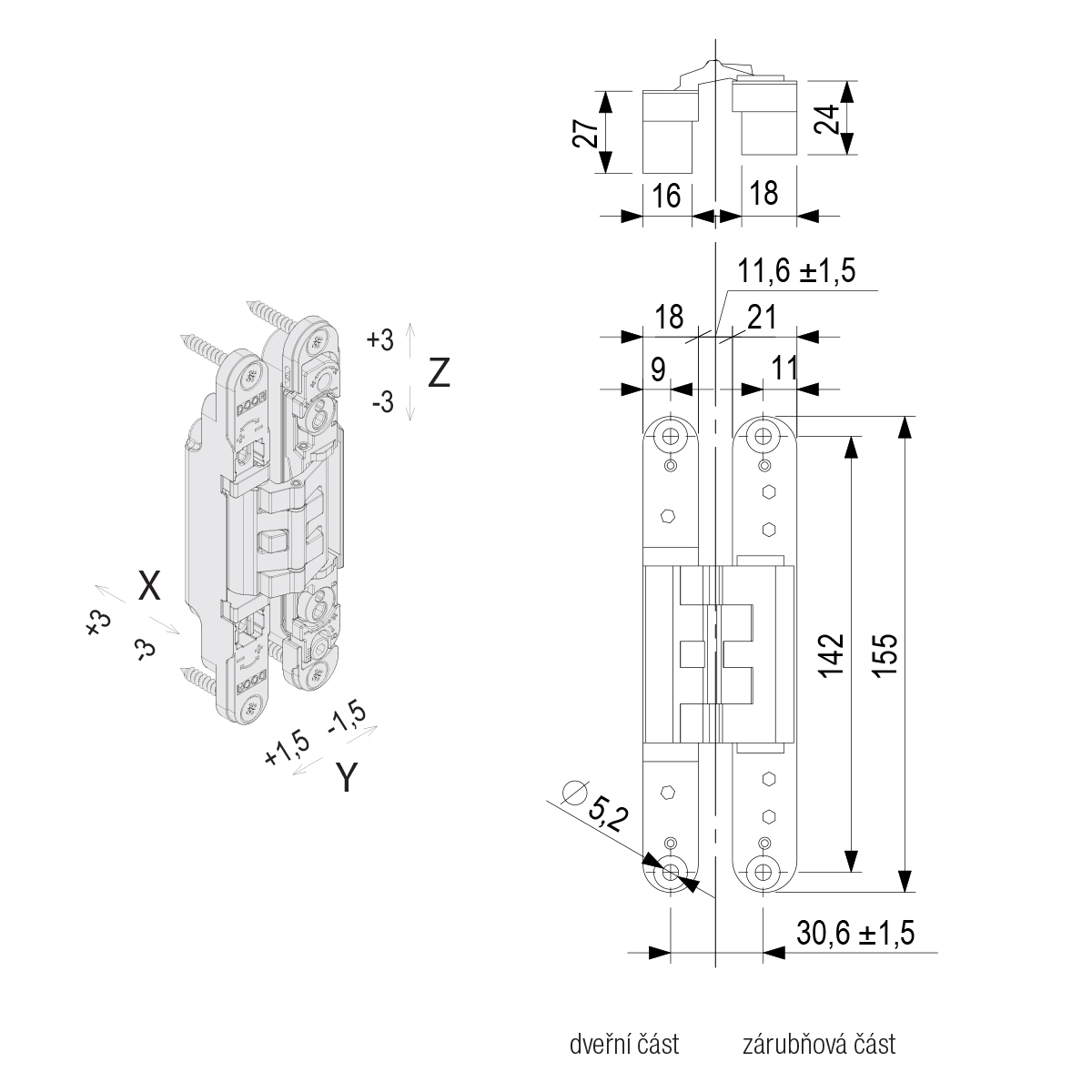 Charniere pour porte sans feuillure avec réglage 3D : réglage en hauteur et profondeur ± 3 mm, réglage latéral ± 1,5 mm. Charge maximale de la porte : 60 kg pour 2 charnieres. Épaisseur minimale de la porte : 25 mm. Remplacement de 255976, augmentation de la charge admissible. Épaisseur minimale de la porte : 25 mm. Trou de montage identique a celui pour Tectus 240D. Accessoires optionnels : attaches pour cadres d'encadrement ou cadres en acier. Gabarit de montage 256045 (cadre) + 256046 (inserts).