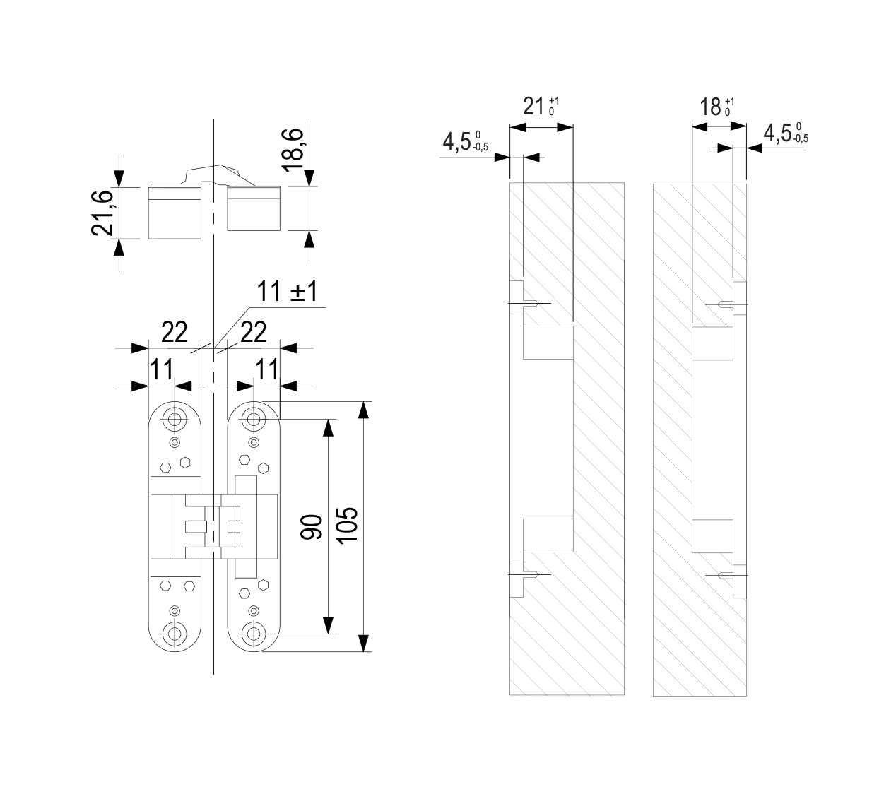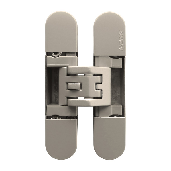 Charniere pour porte sans feuillure avec réglage 3D. Réglage en hauteur et profondeur +/- 3 mm, réglage latéral +/- 1,5 mm. Charge maximale de la porte 30 kg pour 2 charnieres, 45 kg pour 3 charnieres. Épaisseur minimale de la porte 30 mm. Accessoires optionnels : fixations pour cadres en bois ou en acier. Gabarit de montage 256045 (cadre) + 268077 (inserts)