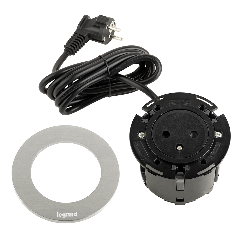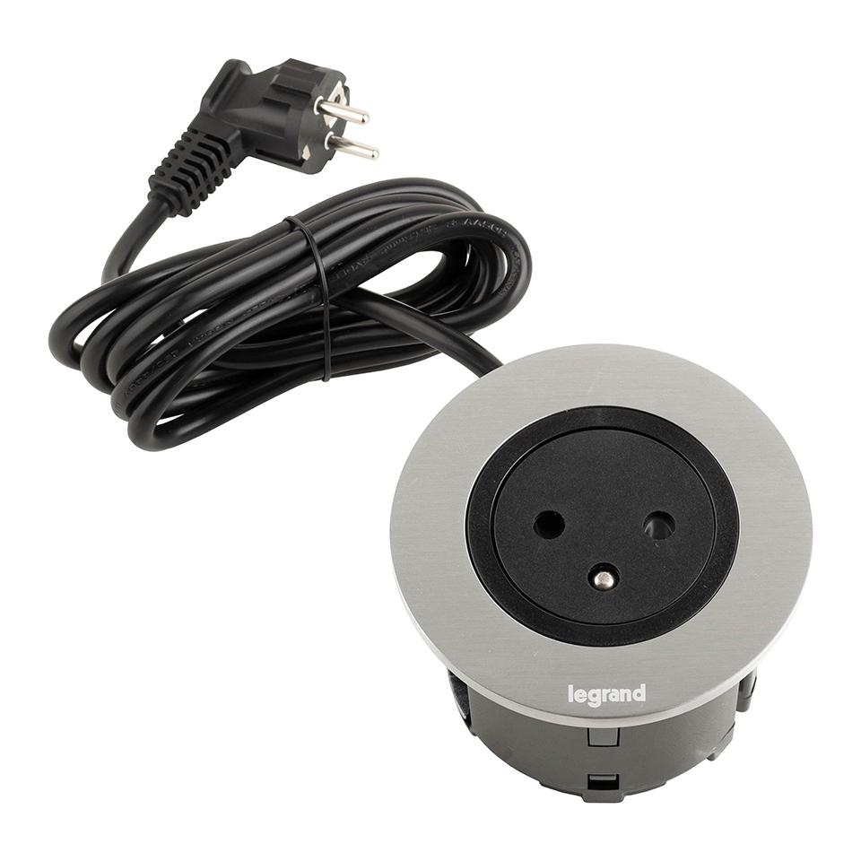 LEGRAND Disq60 prise électrique encastrée 1x230V FR + câble 2m, noir/métal