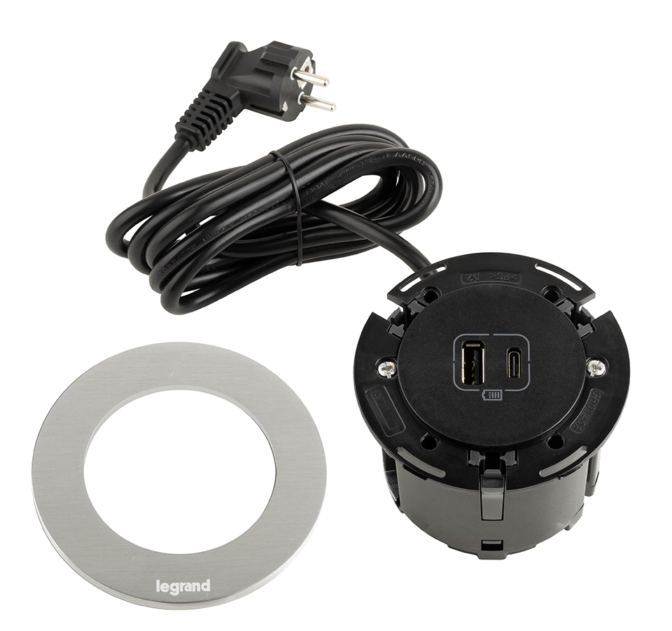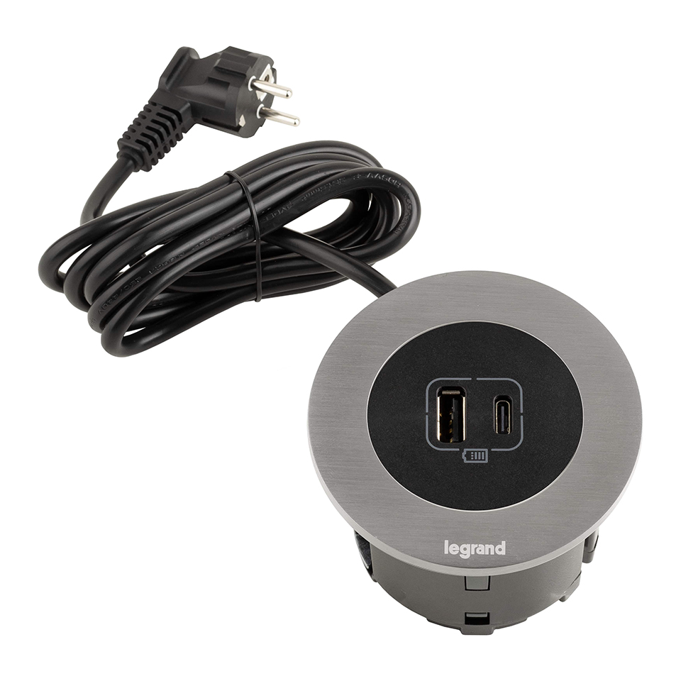 LEGRAND prise électrique Disq60 1x USB A+C chargeur + câble 2m, noir/aluminium