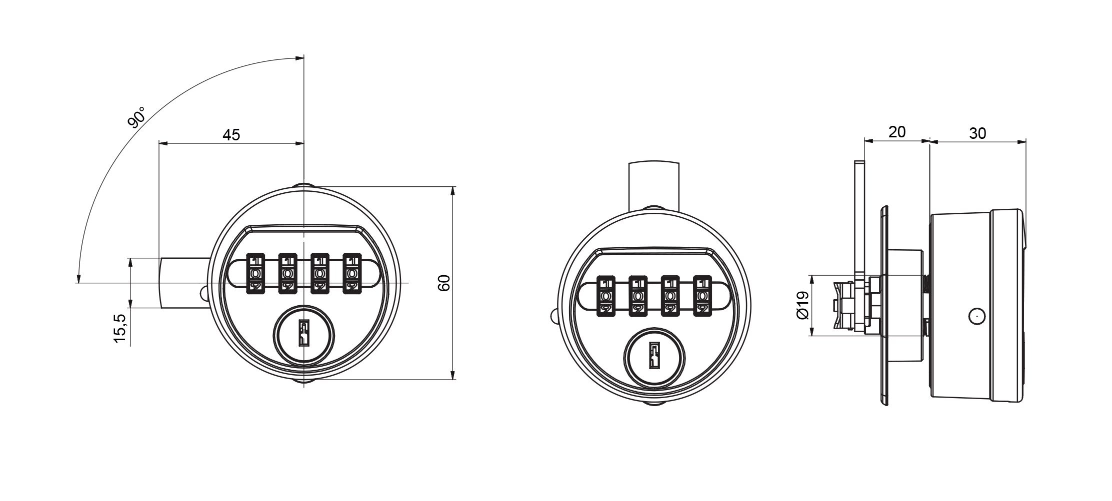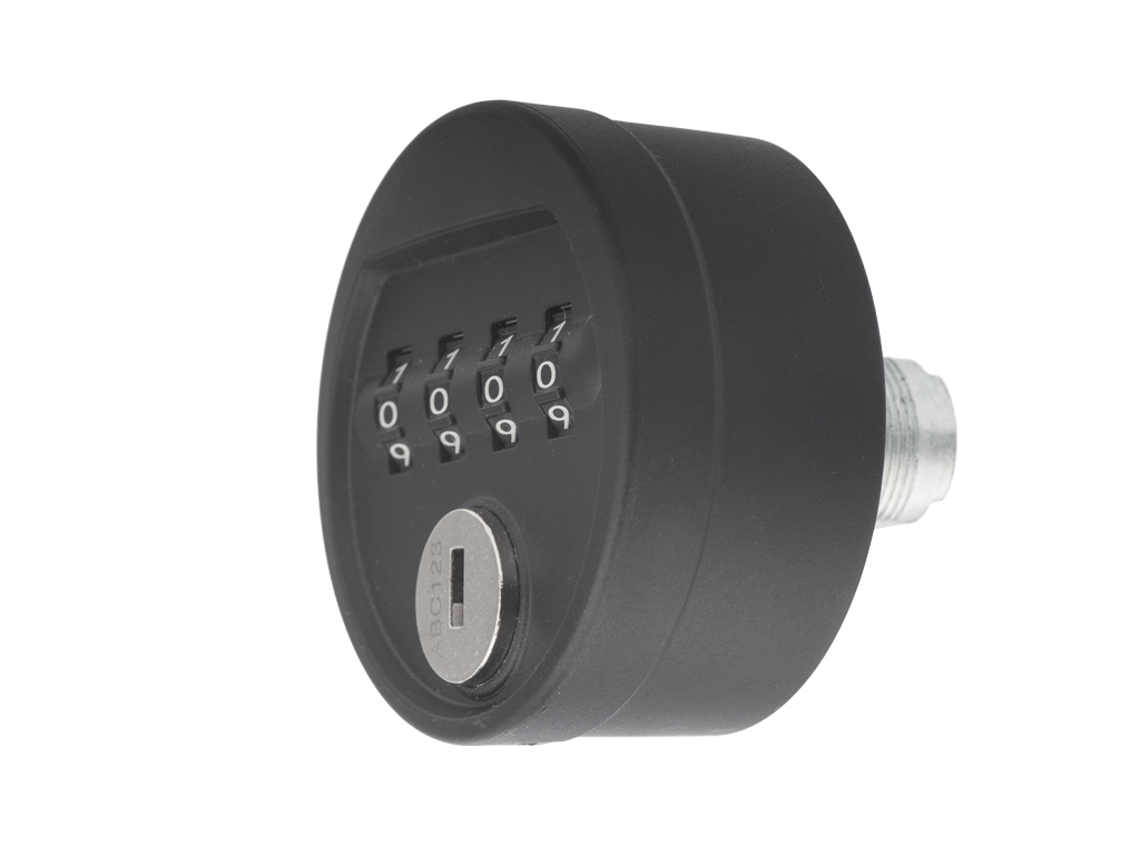 Serrure numérique ronde type 61, couleur noire, droite-gauche, sans pene, pour matériau épaisseur 0,8-12 mm, perçage 16x19 mm, pour clé de secours type Z0001