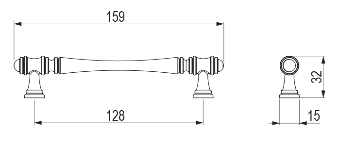 Poignée métallique avec un entraxe de 159mm, d'une longueur totale de 128mm. Largeur : 15mm Hauteur : 32mm