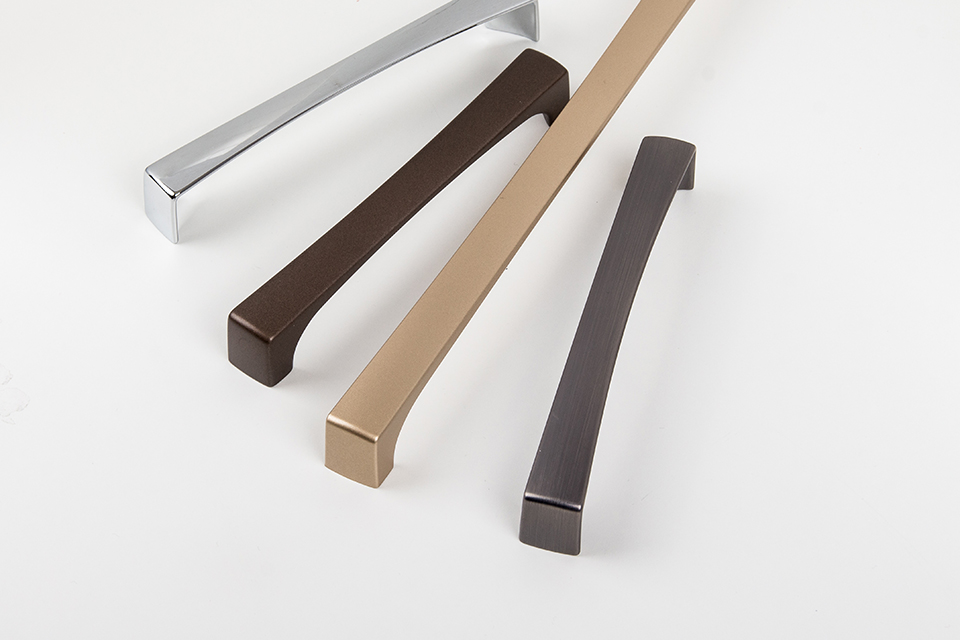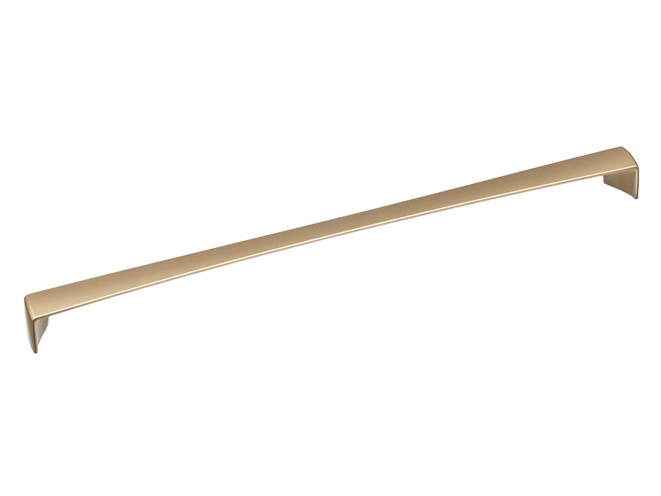 Poignée en zamak, finition métal doré. Longueur : 330 mm, largeur 20 mm, hauteur 26 mm.