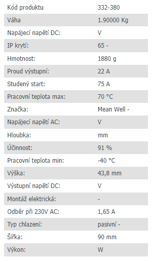 Alimentation a découpage pour LED MEAN WELL 12V/22A, 264W. Tension de sortie : 12V. Régulation de la tension de sortie : 10,8..13,5V. Courant de sortie : 22A. Puissance réelle : 264W. Tension d'entrée AC : 90..305V. Consommation a 230V AC : 1,65A. Rendement : 91%. Démarrage a froid : 75A. Protections intégrées : Surcharge, court-circuit, surtension, surchauffe. Température de fonctionnement : -40..70°C. Poids : 1,88kg. Dimensions : 252 x 90 x 43,8mm. Remarque : Correction active du facteur de puissance, mode courant constant 11..22A.