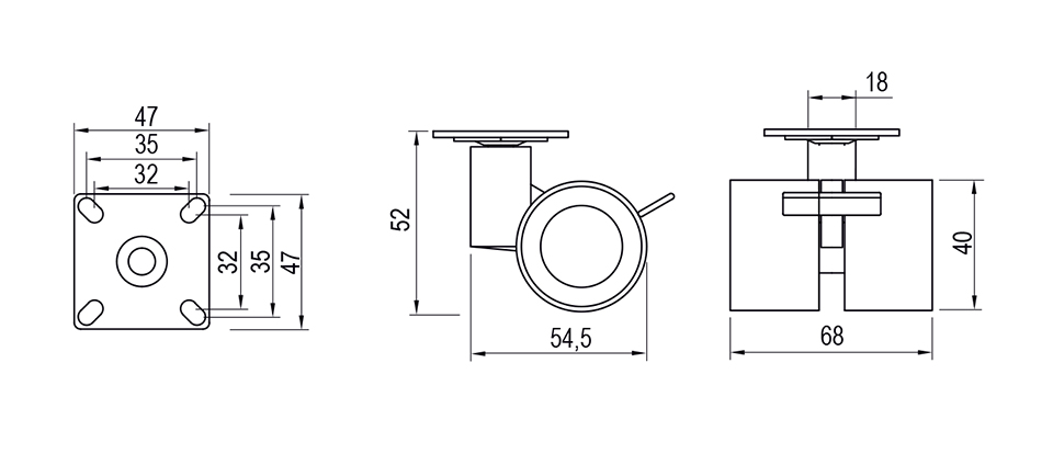 Avec frein. Capacité de charge 35 kg. Hauteur totale 52 mm, largeur 68 mm. Plaquette 47x47 mm incluse.