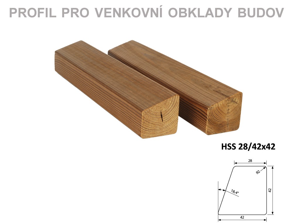 Vnější obkladový profil Borovice (Poloviční rovnoběžník HSS 28/42x42) - Tepelně upravené dřevo ThermoWood - LUNAWOOD. Díky úpravě teplotou 212°C má tento produkt prodlouženou dobu životnosti a lepší užitné vlastnosti.