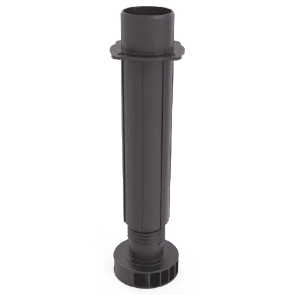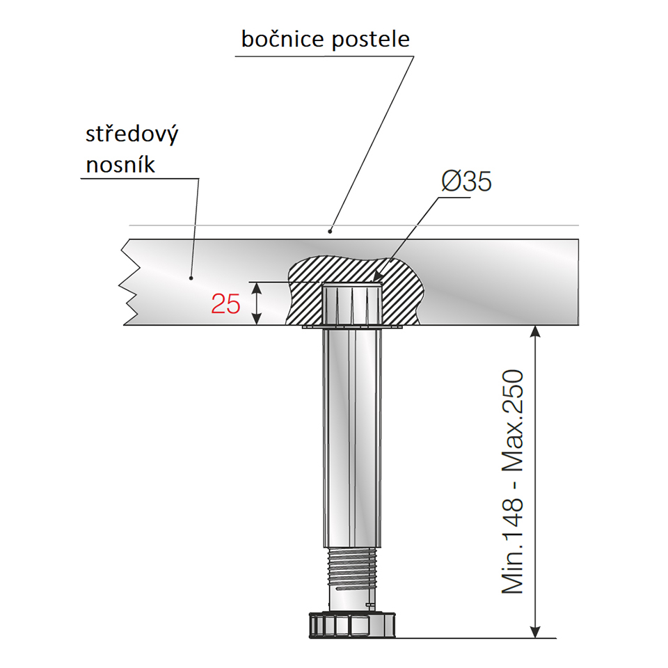 Pied de support pour poutre centrale de lit. Hauteur réglable entre 148 et 250 mm. Capacité de charge 300 kg, plastique noir.
