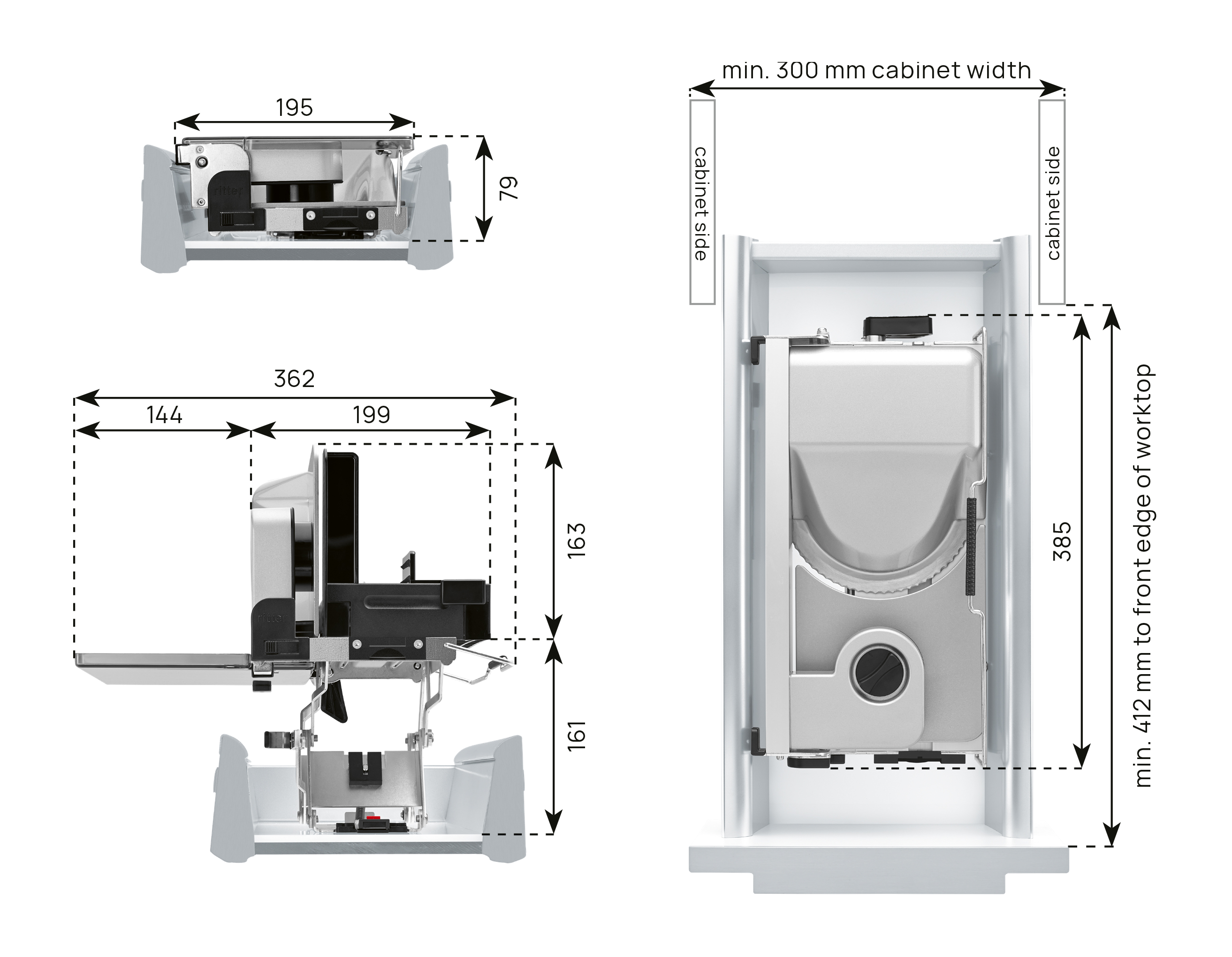 Trancheuse encastrable universelle. Version encastrable pour tiroirs de cuisine de largeur 30 cm ! H : 79 mm L : 195 mm P : 385 mm