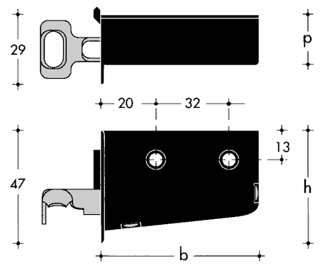 Ferrures suspendues SCILM (Italie) pour caissons suspendus supérieurs. Montage avec vis a bois sur le flanc du caisson. Capacité de charge 70 kg/piece (140 kg/paire). La capacité maximale dépend de la fixation de la quincaillerie au caisson et de la fixation du contrepiece/fixation suspendue sur le mur.