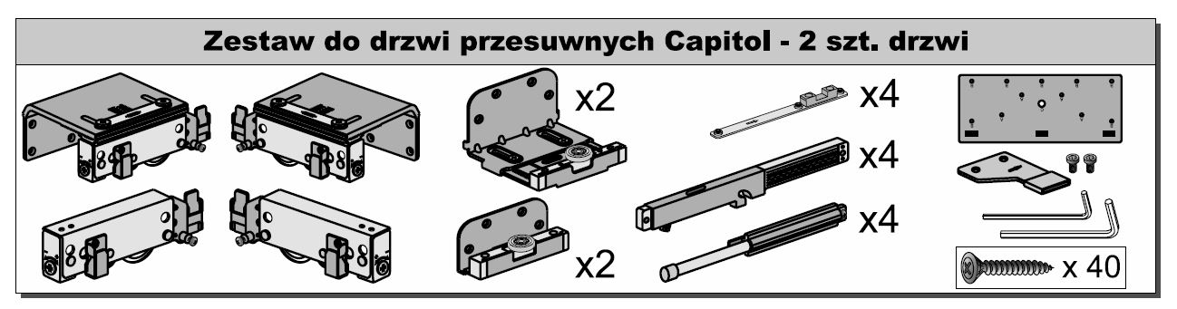 Ensemble de ferrures pour deux vantaux, porte intérieure et extérieure. Pour extension a trois vantaux, il est nécessaire d'utiliser la quincaillerie 395031 SEVROLL Capitol ensemble de ferrures pour portes intérieures.