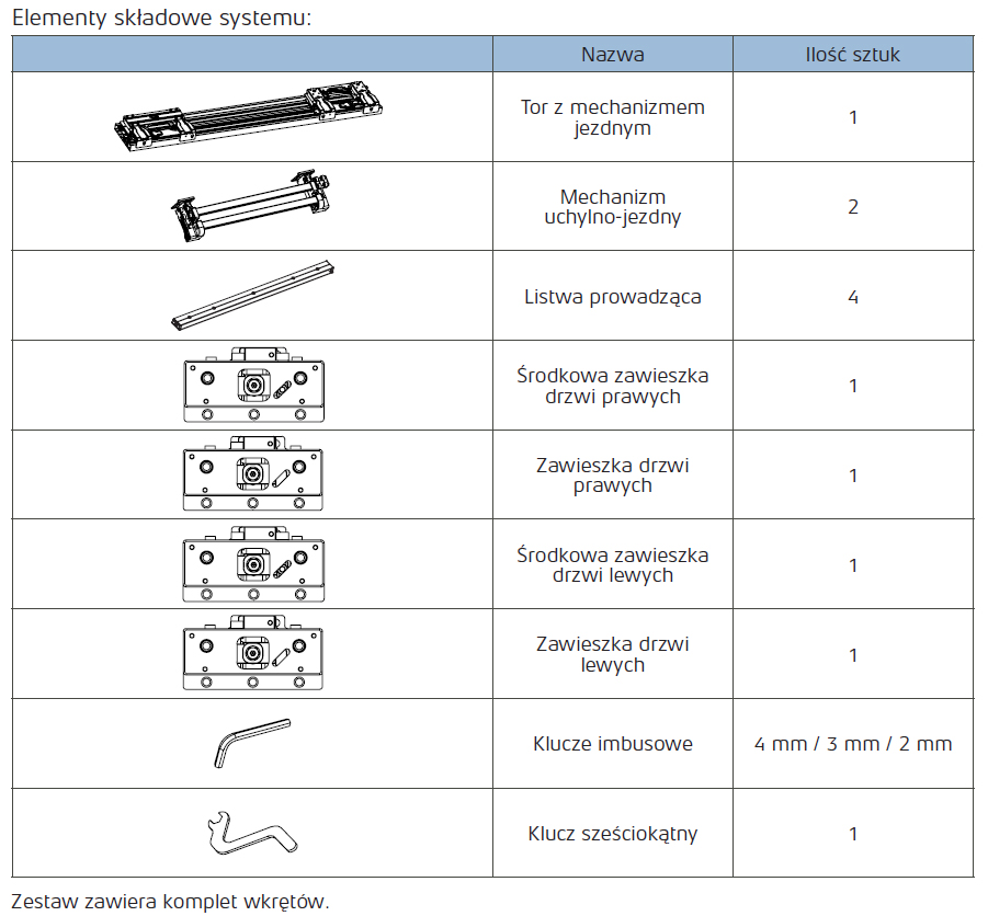 Ensemble de ferrures pour deux portes sur un meme plan. Largeur intérieure de l'armoire 1750 - 2350 mm, largeur d’un vantail 900 - 1200 mm, hauteur maximale du vantail 1500 mm, poids maximal du vantail 20 kg. Épaisseur du matériau 15 - 22 mm. L'ensemble comprend toute la quincaillerie nécessaire a l'ouverture des portes. Le guidage avec mécanisme roulant peut etre monté en haut ou en bas.