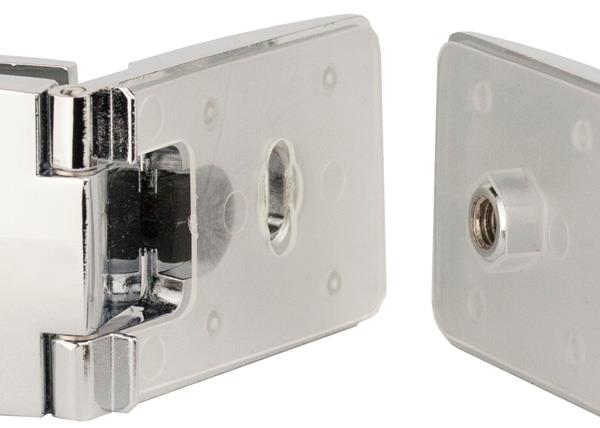 Závěs na vrtaná skleněná dvířka, bočnice může být vrtané sklo, nebo dřevo. Pro tloušťku skla 4-6,75mm. Vrtání pr. 10mm. Povrchová úprava: chrom Charniere pour porte en verre percée, côté peut etre en verre percé ou en bois. Pour épaisseur de verre 4-6,75mm. Perçage O 10mm. Finition : chrome