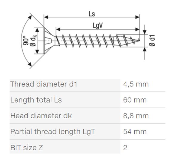 SPAX vis a bois 4,5x60mm tete fraisée PZ,W,4C MH