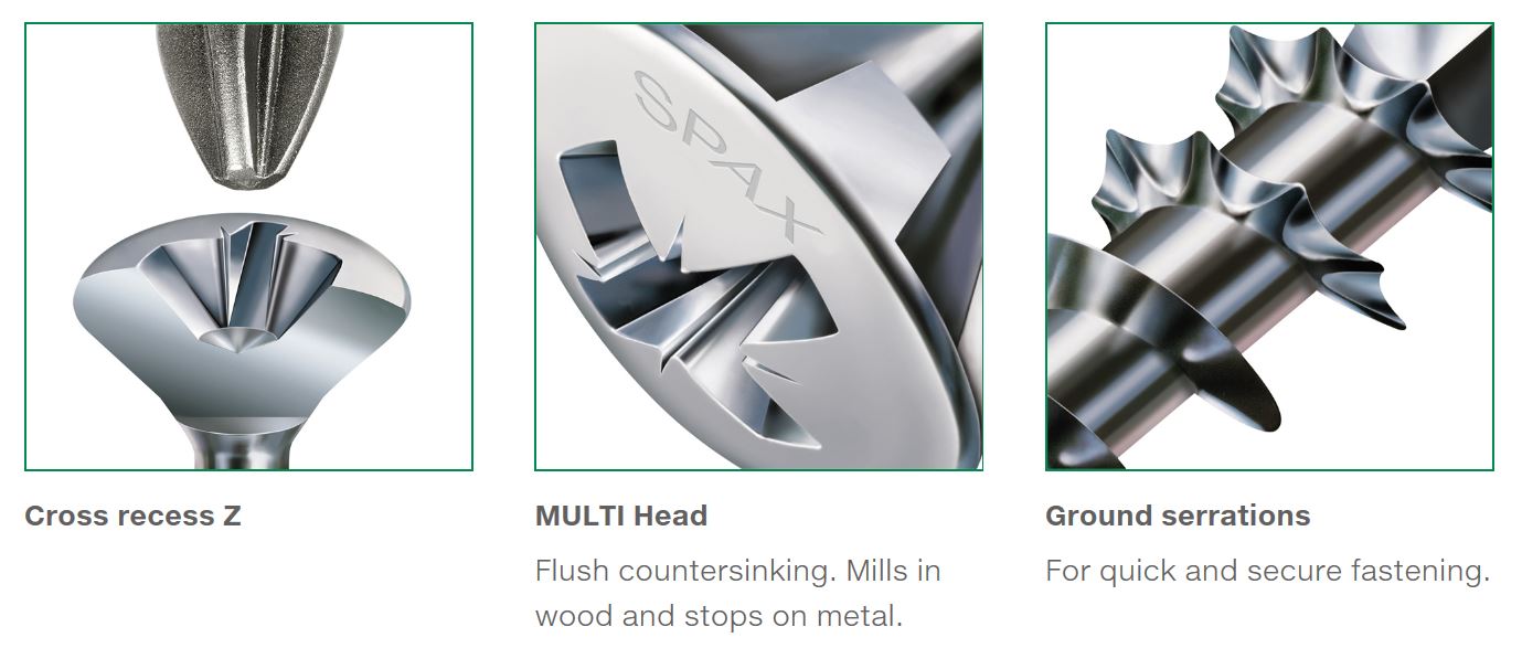 La tete MULTI limite le risque de rotation de la vis lors de la fixation des charnieres, tiroirs coulissants, etc. Lors du serrage dans le métal, le couple de torsion augmente significativement et évite ainsi la rotation des vis. Dans le bois, cela garantit une fraise propre. Tout cela signifie une plus grande assurance d'un travail de qualité et permet l'utilisation de vitesses plus élevées lors du vissage, ce qui permet un gain de temps.