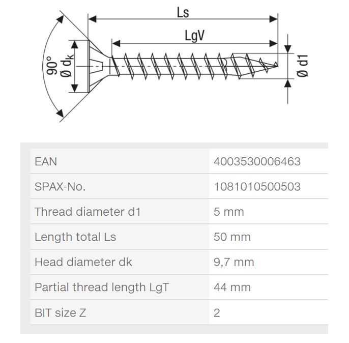 SPAX vis a bois 5x50 tete fraisée PZ, W, A3J 4C MH