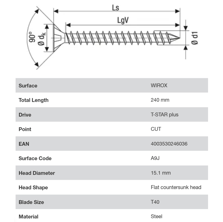 SPAX vis a bois 8x240 tete fraisée TXS,W,4C MH, filet complet