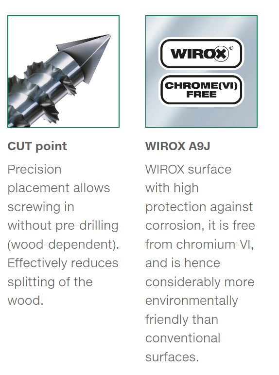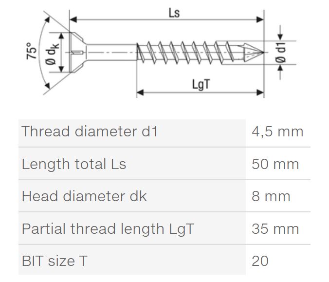 type de meche : T-STAR plus 20. Particulierement adapté aux panneaux MDF. Sans pré-perçage (mais pour certains, le pré-perçage est nécessaire), réduction du risque de déchirure et de soulevement du matériau. Pointe CUT avec filetage ondulé pour un vissage facile. Tete spéciale étroite avec angle de 75° et rainure fraiseuse pour un fraisage propre. Filetage partiel pour un serrage ferme de la piece supérieure. Finition de surface WIROX - 20 × plus grande résistance a la corrosion comparée aux vis classiques. Les avantages susmentionnés combinés a la rainure T-STAR plus. Il est recommandé d’utiliser des meches originales T-STAR plus, garantissant un fonctionnement parfait. Le montage assure un meilleur centrage et transfert de force, empechant le dérapage sous pression latérale. Le travail avec des meches Torx classiques ne permet pas de tirer pleinement parti des avantages de la rainure améliorée. Également utilisé comme remplacement des confirmats.