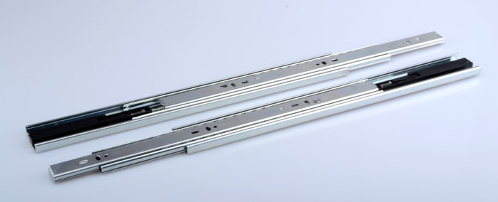 Glissiere a billes a extension totale avec mécanisme d’ouverture automatique. Longueur 350 mm. Capacité dynamique pour cette longueur : 35 kg. ATTENTION : il n’est pas possible d’ouvrir de maniere « classique », cela endommagerait le mécanisme (cassage du loquet) et le tiroir coulissant ne resterait pas fermé.