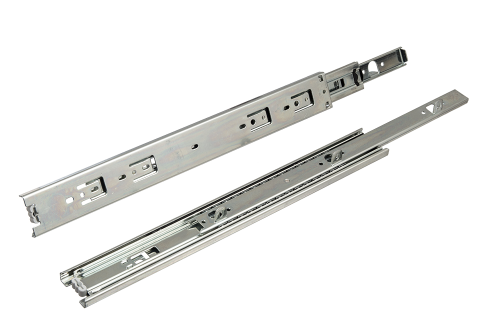 Glissiere a billes a extension totale 550mm avec support, montage sur le bord inférieur du côté du tiroir. La capacité de charge dynamique pour cette longueur est de 45kg.